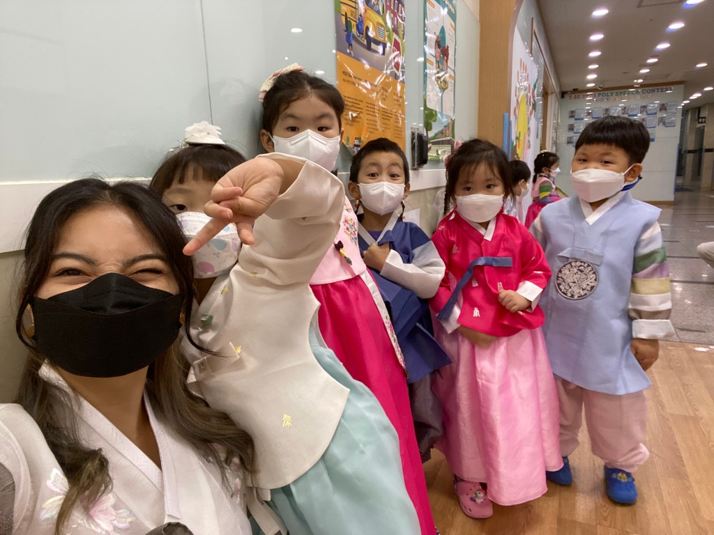 2021: A photo taken with my students aged 3-4 years old (International Age) during ‘Chuseok’ (추석) also known as ‘Mid-Autumn Festival’, students and teachers celebrate this holiday by wearing Korean traditional clothing called ‘Hanbok’ (한복) and eating delicious rice cakes.